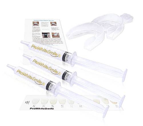 ProWhiteSmile Excel System contains 3 Large 10ml Syringes of Carbamide Peroxide Gel(16%or 22%). 2 Thermoform Custom Trays and Easy to Follow Instructions. Tooth Shade Guide.